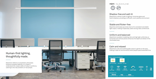 Gleamline is an advanced indoor linear LED luminaire designed for commercial and institutional spaces such as schools, offices, and studios, particularly those dependent on video conferencing. Its indirect illumination reduces glare and harsh shadows, creating a comfortable visual environment. With uniform light distribution, enhanced depth perception, and a design-registered form, Gleamline combines innovation with elegance. Energy-efficient and sustainable, it offers 50% energy savings, a 50,000-hour lifespan, 90% recyclability, and smart features like Bluetooth, PoE, and WiFi connectivity, making it a future-ready lighting solution.
