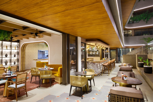 Nora’s Cantina at Novotel Goa Panjim captures the essence of Spanish and Portuguese heritage through its architecture and interiors. Framed by graceful arches and bathed in natural light from expansive glass windows, the space feels open, airy, and inviting. Traditional blue-and-white ceramics pay homage to Portuguese tiles, while rustic wooden ceiling beams and patterned tile flooring add warmth and authenticity. Illuminated shelves showcasing ceramic accents enrich the texture of the space, complemented by subtle pops of red floral patterns on the carpet. The thoughtful fusion of textures, colors, and cultural motifs creates a homely yet sophisticated Iberian dining experience.